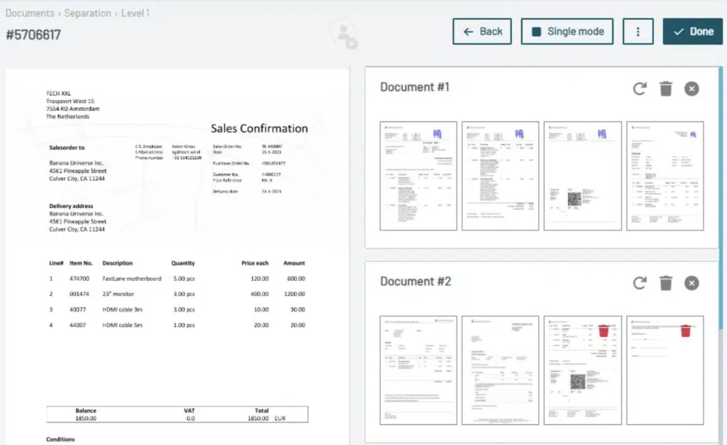 Manuelle Seitentrennung: In Anerkennung der Notwendigkeit von Flexibilität umfasst Parashift eine manuelle Trennfunktion innerhalb seiner Benutzeroberfläche. Dies ermöglicht es Benutzern, Dokumententrennungen manuell anzupassen oder zu bestätigen und bietet eine zusätzliche Kontrolle über den Prozess.
