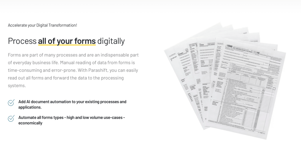 Enterprises face significant challenges in managing the vast amounts of data received through forms. Traditional manual processing methods are not only inefficient but also prone to errors. The Parashift IDP Platform emerges as a digital solution, automating the extraction and processing of data from forms using advanced AI technologies.
